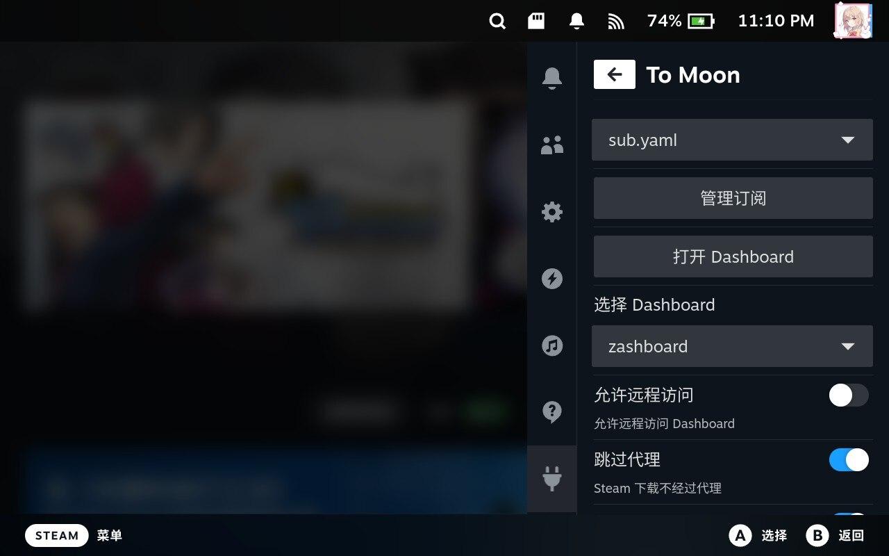安装完成后,回到游戏模式,菜单里就多出来了插件页面。打开 ToMoon 插件,输入订阅地址,就可以正常地使用 Steam 的网络了。