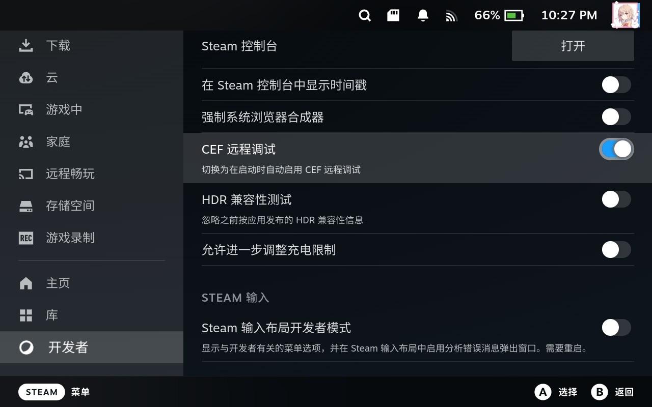 按照 ToMoon仓库中的指示,安装 Decky Loader之前,需要先打开开发者模式和CEF调试: