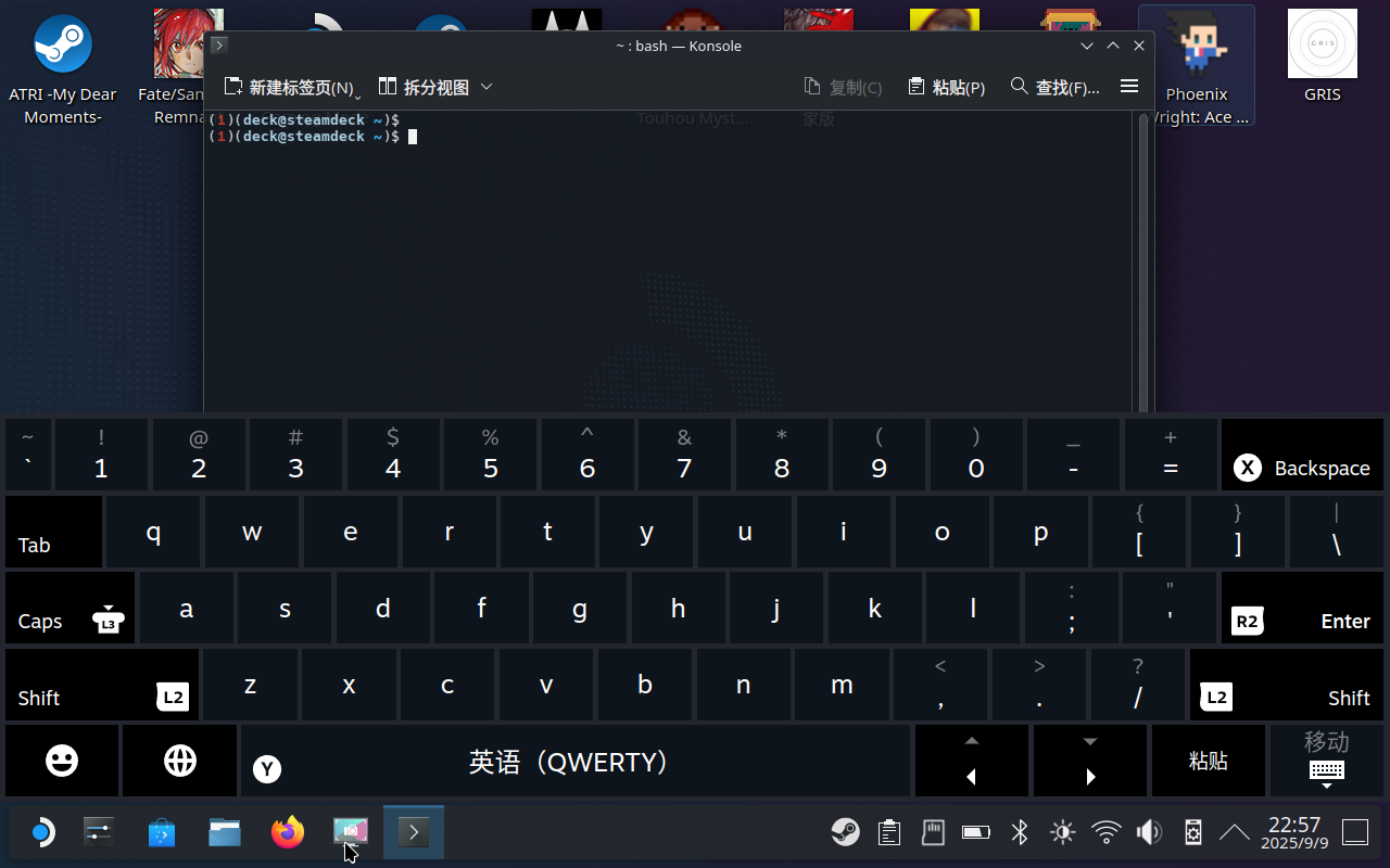 然后长按电源键切换到桌面模式,在终端中使用passwd设置密码,然后使用命令安装Decky Loader和ToMoon。在桌面模式下,触控板移动鼠标,右扳机是鼠标左键,左扳机是鼠标右键,按 Steam+X 呼出虚拟键盘。