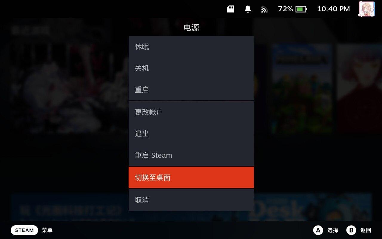初次启动前,需要在桌面模式下打开,完成一些账号登录之类的设置。这些设置完之后,就可以在游戏模式里直接打开了。
