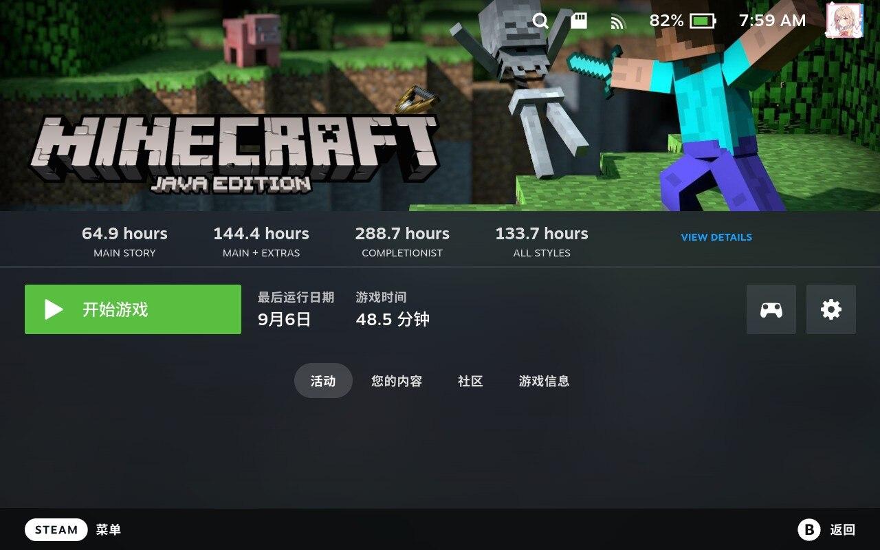 下载完成后,在开始菜单中找到Prism Launcher,右键「添加到Steam」,便可在游戏模式的库中找到它。之后,将其名称修改为「Minecraft」,再用插件设置好封面图,它看起来就和原生Steam游戏别无二致了,甚至连HLTB插件都能识别出它的通关时长。