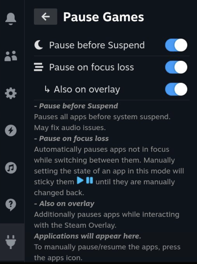 这个插件会在设备休眠前或弹出窗口时自动暂停游戏,从而解决部分游戏从休眠中恢复后声音撕裂的问题。