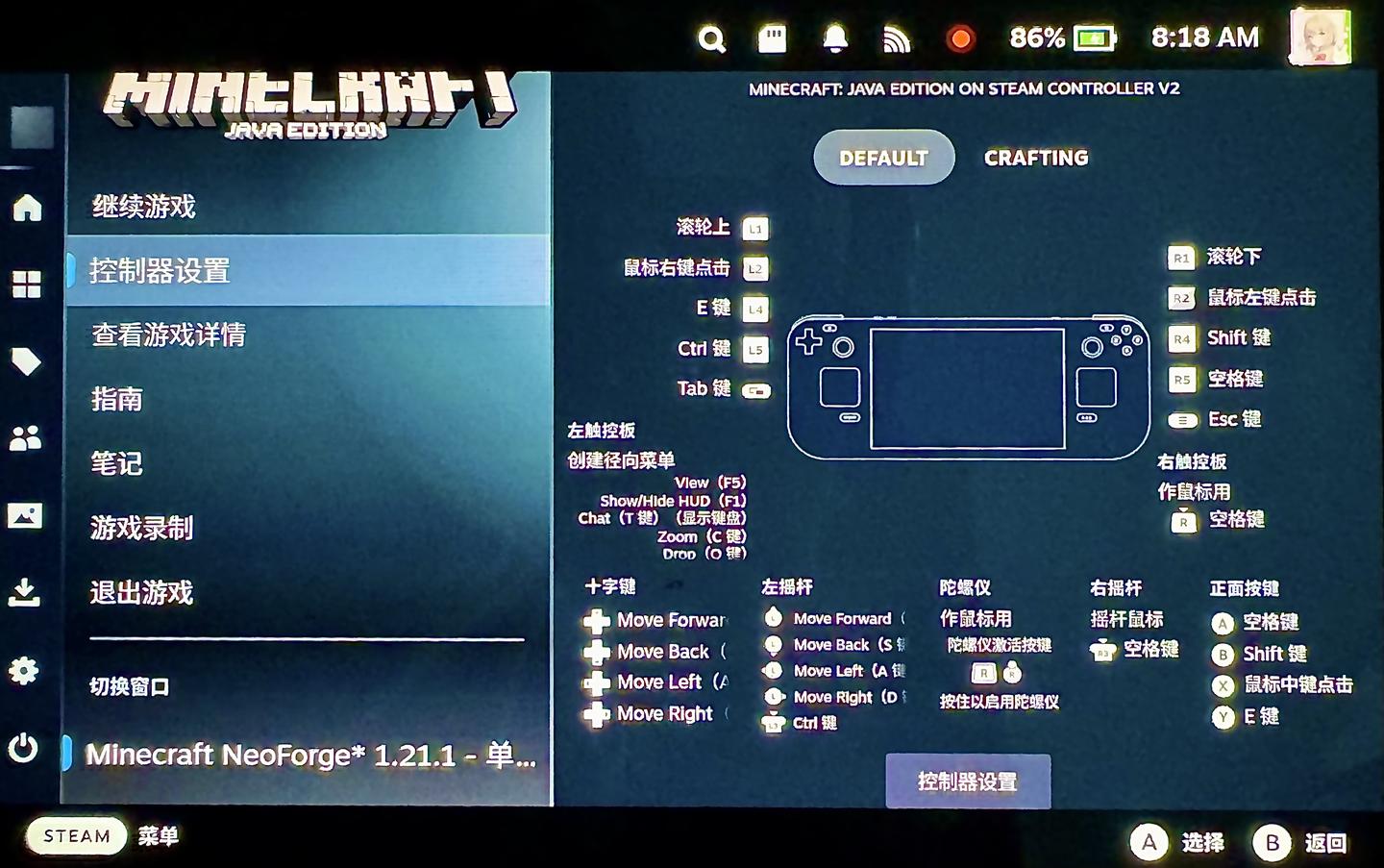 不过,这也暴露了一个问题:掌机手柄上的按键实在是太少了。即便Steam Deck已经提供了额外的触摸板和双背键,也仅仅是刚好满足Minecraft原版的按键需求。如果要玩那些需要大量自定义按键的模组,就有些力不从心了。