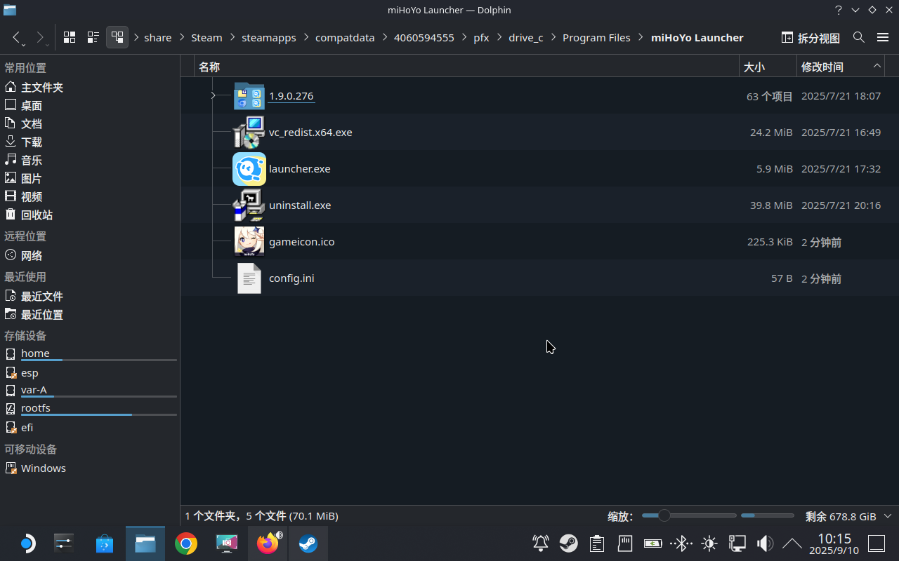 安装完成后,先不要直接启动。需要先在 ~/.local/share/Steam/steamapps/compatdata/XXXXX/pfx/drive_c 这个路径里找到刚刚装好的启动器。中间那个 XXXXX 是一串数字ID,可以根据文件修改时间找到最新的。