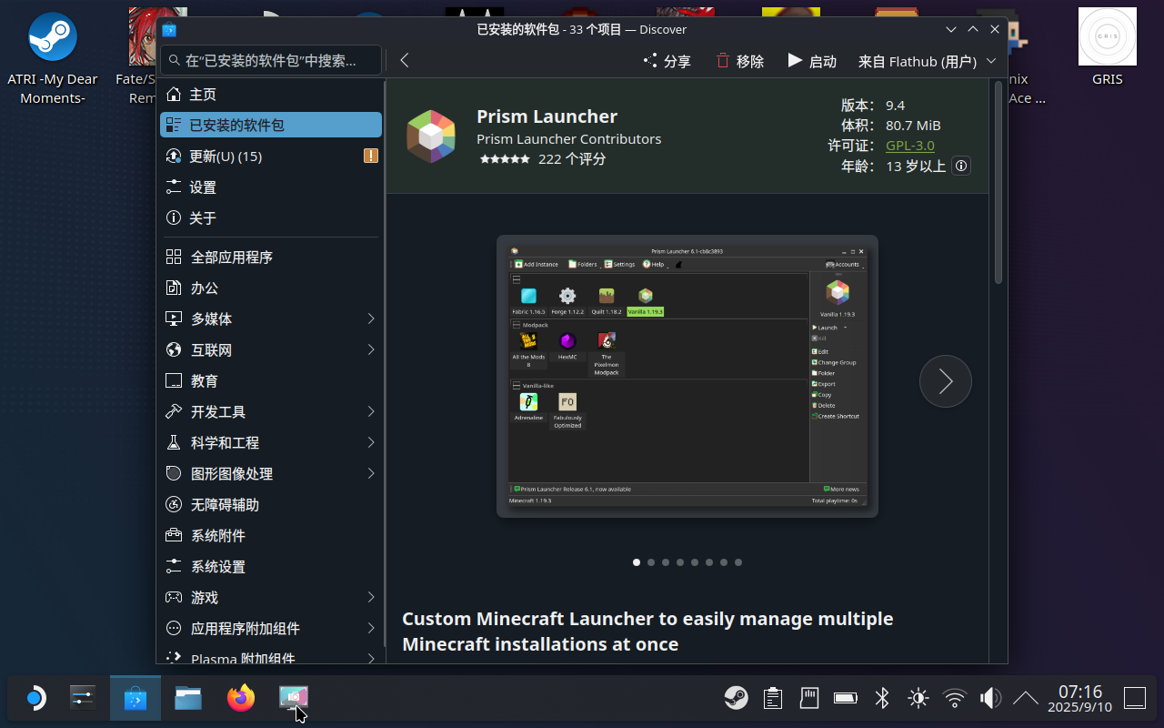 作为一款跨平台适配极佳的游戏,在SteamOS上运行Minecraft当然不在话下。我这里用了点比较偷懒的方法:直接在桌面模式的Discover应用商店里下载Prism Launcher。